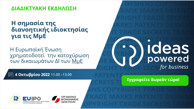 Το Γραφείο Διανοητικής Ιδιοκτησίας της Ευρωπαϊκής Ένωσης (EUIPO) και ο Οργανισμός Βιομηχανικής Ιδιοκτησίας (ΟΒΙ) καλούν επιχειρήσεις και φορείς να συμμετάσχουν στη δωρεάν διαδικτυακή εκδήλωση που θα πραγματοποιήσουν την Τρίτη 4 Οκτωβρίου 2022 και ώρα 11.00.