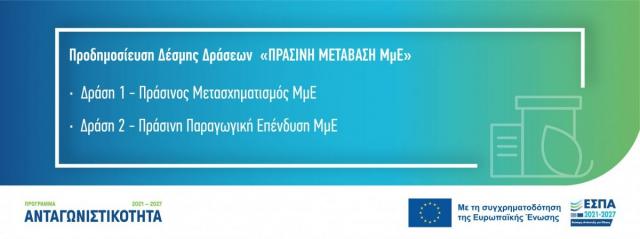Προδημοσιεύθηκε η Δέσμη Δράσεων κρατικών ενισχύσεων «ΠΡΑΣΙΝΗ ΜΕΤΑΒΑΣΗ ΜμΕ» του Προγράμματος «Ανταγωνιστικότητα» (ΕΣΠΑ 2021 – 2027) με συνολικό προϋπολογισμό 700.000.000 €, η οποία στοχεύει στην αναβάθμιση των μικρομεσαίων επιχειρήσεων της χώρας.