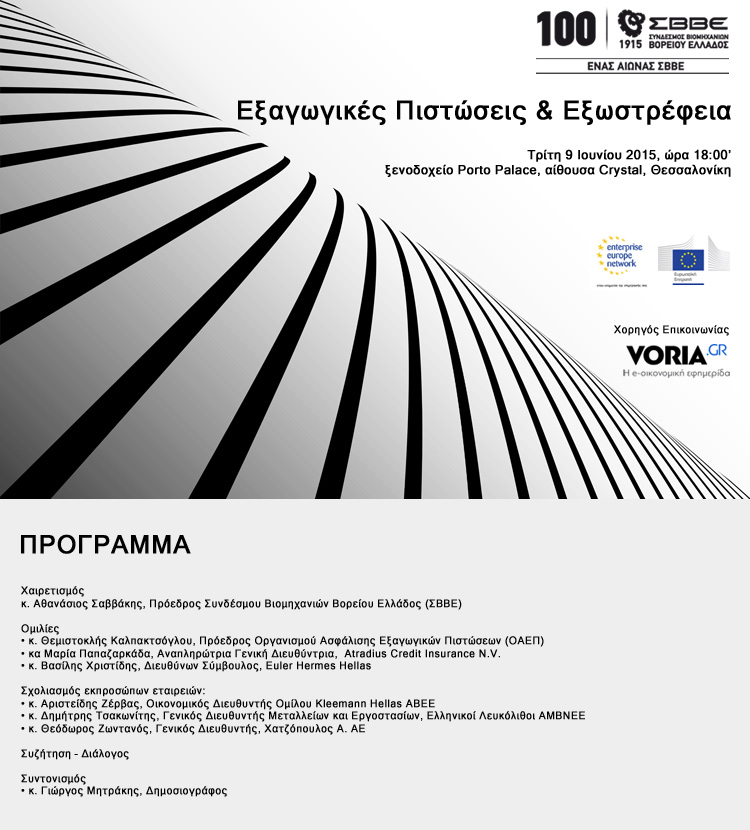 «Εξαγωγικές Πιστώσεις και Εξωστρέφεια» είναι το θέμα της εκδήλωσης που διοργανώνει ο Σύνδεσμος Εξαγωγέων Βορείου Ελλάδος, την Τρίτη 9 Ιουνίου 2015, ώρα 18:00 στο ξενοδοχείο Porto Palace στη Θεσσαλονίκη.