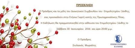 Ο Πρόεδρος και τα μέλη του Διοικητικού Συμβουλίου του Επιμελητηρίου Ξάνθης προσκαλούν όλους τους επιχειρηματίες, εμπόρους, επαγγελματίες, βιοτέχνες, βιομηχάνους αλλά και όλους τους καταναλωτές στην ετήσια γιορτή κοπής της Πρωτοχρονιάτικης Πίτας.