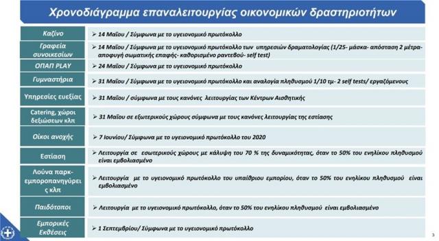 Το χρονοδιάγραμμα επανεκκίνησης οικονομικών δραστηριοτήτων, από σήμερα 14 Μαΐου 2021 μέχρι και την 1η Σεπτεμβρίου 2021, έδωσε στη δημοσιότητα το υπουργείο Ανάπτυξης & Επενδύσεων προκειμένου οι επιχειρηματίες να προχωρήσουν στις προετοιμασίες για να λειτουργήσουν ξανά τις δραστηριότητές τους.
