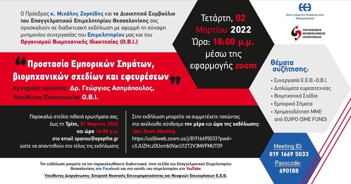 Διαδικτυακή εκδήλωση διοργανώνει το Επαγγελματικό Επιμελητήριο Θεσσαλονίκης με αφορμή τη σύναψη μνημονίου συνεργασίας του Επιμελητηρίου και του Οργανισμού Βιομηχανικής Ιδιοκτησίας (ΟΒΙ).