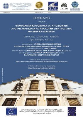 Η Υπηρεσία Νεωτέρων Μνημείων & Τεχνικών Έργων Ανατολικής Μακεδονίας – Θράκης (ΥΝΜΤΕΑΜΘ), του Υπουργείου Πολιτισμού & Αθλητισμού (ΥΠΠΟΑ), στο πλαίσιο του εορτασμού των Ευρωπαϊκών Ημερών Πολιτιστικής Κληρονομιάς (ΕΗΠΚ) 2022 - «Βιώσιμη Πολιτιστική Κληρονομιά - Συντηρώντας το παρελθόν για τις μελλοντικές γενιές», αναλαμβάνει την πρωτοβουλία, με την αιγίδα της Κεντρικής Ένωσης Δήμων Ελλάδας [Κ.Ε.Δ.Ε.], συνδιοργανωτή το Δήμο Καβάλας και την υποστήριξη του Ελληνικού Τμήματος TICCIH και της Ελληνικής Εταιρείας Περιβάλλοντος και Πολιτισμού - Παραρτήματος Θεσσαλονίκης, της οργάνωσης διαδικτυακού Σεμιναρίου για στελέχη των Οργανισμών Τοπικής Αυτοδιοίκησης με θέμα: «Βιομηχανική Κληρονομιά και Αυτοδιοίκηση: από την αναγνώριση και αξιολόγηση στην προστασία, ανάδειξη και διαχείριση».