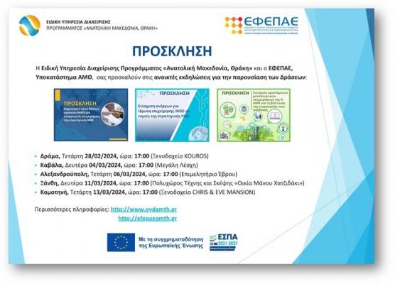 Η Ειδική Υπηρεσία Διαχείρισης Προγράμματος «Ανατολική Μακεδονία, Θράκη» και ο ΕΦΕΠΑΕ, Υποκατάστημα ΑΜΘ διοργανώνουν ενημερωτικές εκδηλώσεις για την παρουσίαση των Δράσεων Επιχειρηματικότητας: