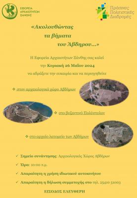 Με αφετηρία τον αρχαιολογικό χώρο Αβδήρων, οι συμμετέχοντες θα περιηγούν σε τμήματα της αρχαίας πόλης, θα γνωρίσουν σημαντικά κατάλοιπα του βυζαντινού Πολυστύλου και θα εξερευνήσουν το αρχαίο λατομείο των Αβδήρων, που βρίσκεται νότια του σύγχρονου οικισμού της Μάνδρας. Τα μνημεία αυτά έχουν δεχτεί ήπιες επεμβάσεις στο πλαίσιο της συγχρηματοδοτούμενης Πράξης «Ανάδειξη Συμπληρωματικών Αρχαιολογικών Χώρων Αβδήρων» (ΟΧΕ 2014-2020).
