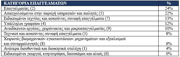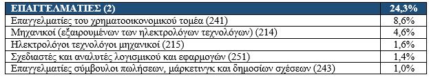 Αναλυτικότερα, ανά επαγγελματική κατηγορία (Πρωτοβάθμια κατάταξη ESCO), οι πέντε δημοφιλέστερες υποκατηγορίες επαγγελμάτων (Δευτεροβάθμια &Τριτοβάθμια κατάταξη ESCO) είναι: