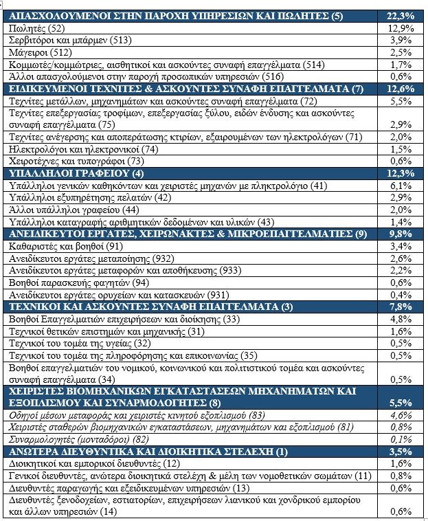 Για την καταγραφή των αναγκών σε επαγγελματικές ειδικότητες χρησιμοποιήθηκε το σύστημα κατάταξης των επαγγελμάτων ESCO (European Skills, Competences and Occupations). Σύμφωνα με τα αποτελέσματα της έρευνας, στο ερώτημα για τη σημαντικότερη ειδικότητα για τη λειτουργία των επιχειρήσεων, η κατάταξη στο σύνολο των επιχειρήσεων της χώρας είναι η εξής (Πρωτοβάθμια Κατάταξη ΕSCO):
