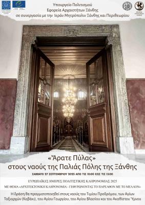 Ο εορτασμός των Ευρωπαϊκών Ημερών Πολιτιστικής Κληρονομιάς 2025 (26 – 28 Σεπτεμβρίου 2025), του ετήσιου πανευρωπαϊκού θεσμού του Συμβουλίου της Ευρώπης και της Ευρωπαϊκής Ένωσης, έχει ως θέμα Αρχιτεκτονική Κληρονομιά – Γεφυρώνοντας το παρελθόν με το μέλλον. Τις εκδηλώσεις συντονίζει η Διεύθυνση Αρχαιολογικών Μουσείων, Εκθέσεων και Εκπαιδευτικών Προγραμμάτων του Υπουργείου Πολιτισμού. Η Εφορεία Αρχαιοτήτων Ξάνθης, σε συνεργασία με την Ιεράν Μητρόπολιν Ξάνθης και Περιθεωρίου, συμμετέχει με τη δράση «Ἄρατε Πύλας» στους ναούς της Παλιάς Πόλης της Ξάνθης.