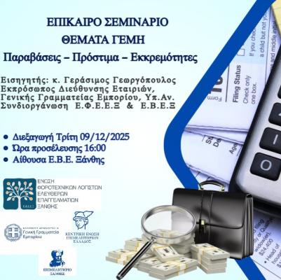 Το σεμινάριο θα πραγματοποιηθεί την Τρίτη 9 Δεκεμβρίου 2025, με ώρα προσέλευσης 16:00, στην Αίθουσα Συνεδριάσεων του Επιμελητηρίου Ξάνθης.
