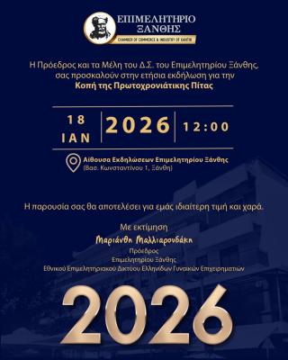 Η Πρόεδρος και τα μέλη του Διοικητικού Συμβουλίου του Επιμελητηρίου Ξάνθης, σας προσκαλούν στην ετήσια εκδήλωση για την κοπή της Πρωτοχρονιάτικης Πίτας.