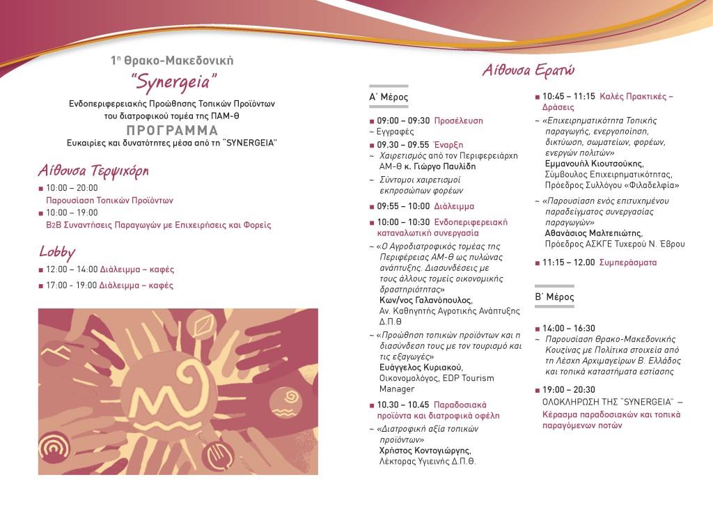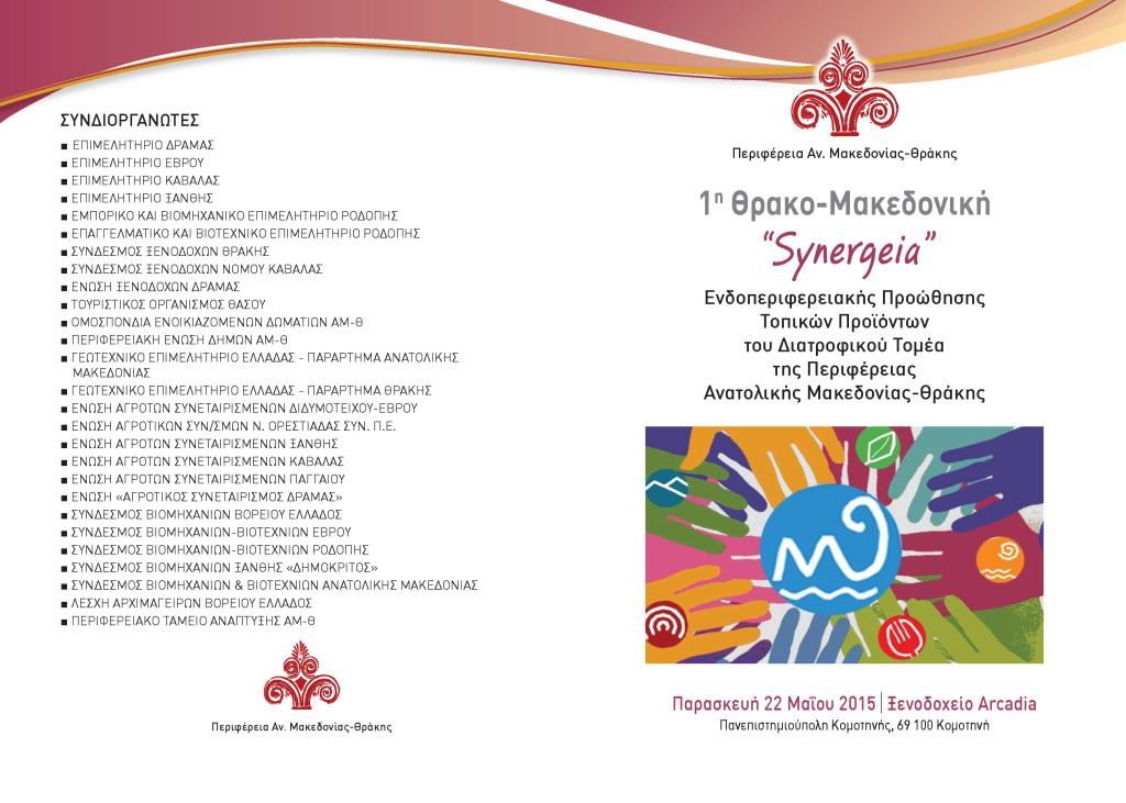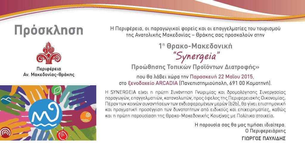 Η Περιφέρεια Ανατολικής Μακεδονίας – Θράκης στο πλαίσιο της πολιτικής της για διαμόρφωση ενδοπεριφερειακής καταναλωτικής συνείδησης και οικονομικής αλληλεγγύης, αποφάσισε τη σύζευξη προϊόντων της Ανατολικής Μακεδονίας και της Θράκης με τον ευρύτερο τουριστικό χώρο, τους ξενοδόχους, τους χώρους εστίασης και τους χώρους αναψυχής. Προς την κατεύθυνση αυτή οργανώνεται η «1η Θρακο-Mακεδονική “SYNERGEIA” Προώθησης Τοπικών Προϊόντων» στις 22 Μαΐου 2015.