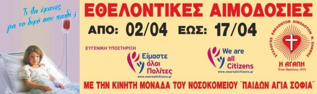 Το Διοικητικό Συμβούλιο του Συλλόγου Εθελοντών Αιμοδοτών Ν. Ξάνθης «Η ΑΓΑΠΗ» ενημερώνει ότι ξεκινάνε από το Σάββατο 2 Απριλίου έως την Κυριακή 17 Απριλίου οι ΕΑΡΙΝΕΣ ΑΙΜΟΔΟΣΙΕΣ ΑΓΑΠΗΣ 2016 σε συνεργασία με τις κινητές μονάδες αιμοδοσίας του Νοσοκομείου Παίδων «Η ΑΓΙΑ ΣΟΦΙΑ» και του Γενικού Νοσοκομείου Ξάνθης. Σε συνδιοργάνωση με τη Διεύθυνση Δευτεροβάθμιας Εκπαίδευσης Ν. Ξάνθης και την Περιφέρεια ΑΜΘ θα προσπαθήσουμε να συλλέξουμε για ακόμη μια φορά αρκετές μονάδες αίματος από τους εθελοντές αιμοδότες της Ξάνθης, προκειμένου με τη δράση μας αυτή να ενισχυθούν και ανακουφιστούν κυρίως οι ανάγκες μετάγγισης των παιδιών ηλικίας από λίγων ημερών έως 14 ετών από ολόκληρη την Ελλάδα που «φιλοξενούνται» στο Νοσοκομείο της Αθήνας. Επίσης για ακόμη μια φορά θα προσπαθήσουμε από τις μονάδες αίματος που θα συλλέξουμε να ανακουφίσουμε και βοηθήσουμε και τα Νοσοκομεία της Μυτιλήνης, του Κιλκίς, των Αθηνών και πιθανόν και της Καβάλας προκειμένου να ανταποκριθούν στις αυξημένες ανάγκες μεταγγίσεων των διαφόρων περιστατικών που αντιμετωπίζουν με τους πρόσφυγες (άτομα πολυμεταγγιζόμενα, διάφορες μορφές αναιμίας σε ηλικιωμένους και γυναίκες, λευχαιμικοί, καρκινοπαθείς κ.α). Η ανθρωπιά και η κοινωνική αλληλεγγύη των Ξανθιωτών, χριστιανών και μουσουλμάνων αποδεικνύεται κάθε φορά έμπρακτα σε κάθε συνάνθρωπό μας ο οποίος έχει ανάγκη.