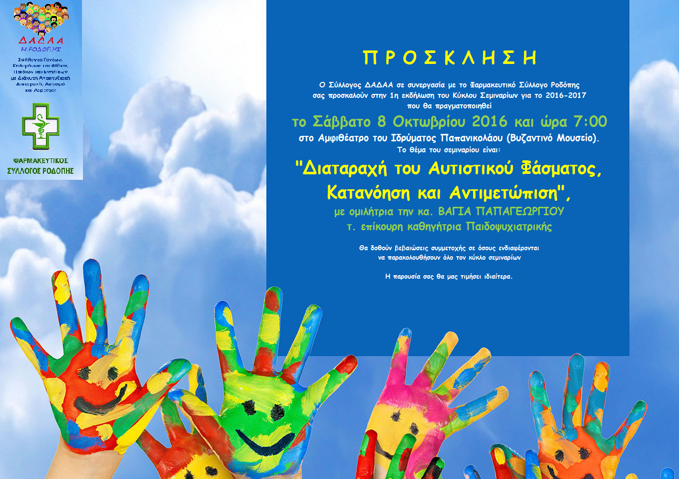 Ο Σύλλογος Γονέως, Κηδεμόνων και Φίλων Παιδιών & Ενηλίκων με Διάχυτη Αναπτυξιακή Διαταραχή, Αυτισμό και Asperger σε συνεργασία με το Φαρμακευτικό Σύλλογο Ροδόπης διοργανώνουν το Σάββατο 8 Οκτωβρίου 2016 και ώρα 19:00, την 1η εκδήλωση του Κύκλου Σεμιναρίων για το 2016-2017.