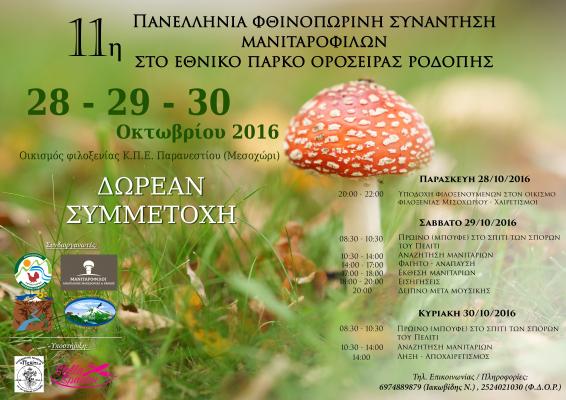 Ο Φορέας Διαχείρισης Οροσειράς Ροδόπης και οι Μανιταρόφιλοι Αν. Μακεδονίας και Θράκης σας προσκαλούν στην 11η Πανελλήνια Φθινοπωρινή γιορτή Μανιταριών στο Εθνικό Πάρκο Οροσειράς Ροδόπης, στον Οικισμό φιλοξενίας του ΚΠΕ Παρανεστίου στο Μεσοχώρι Παρανεστίου, στις 28, 29 και 30 Οκτωβρίου 2016.