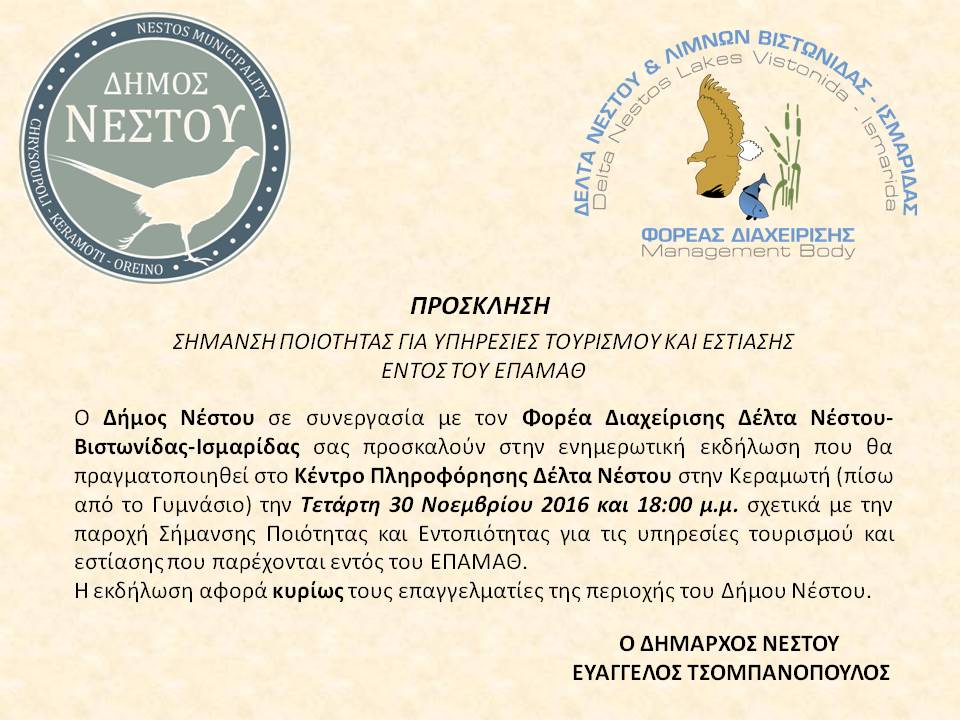 Ο Δήμος Νέστου σε συνεργασία με τον Φορέα Διαχείρισης Δέλτα Νέστου- Βιστωνίδας-Ισμαρίδας διοργανώνουν ενημερωτική εκδήλωση η οποία θα πραγματοποιηθεί στο Κέντρο Πληροφόρησης Δέλτα Νέστου στην Κεραμωτή (πίσω από το Γυμνάσιο), την Τετάρτη 30 Νοεμβρίου 2016 και 18:00 σχετικά με την παροχή Σήμανσης Ποιότητας και Εντοπιότητας για τις υπηρεσίες τουρισμού και εστίασης που παρέχονται εντός του ΕΠΑΜΑΘ και την ανάπτυξη του Οικοτουρισμού στην περιοχή.