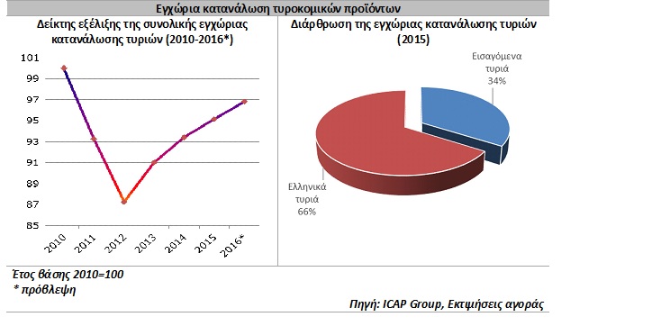 Όπως αναφέρει η Κωνσταντίνα Καλούδη, Consultant Κλαδικών Μελετών, η οποία επιμελήθηκε τη συγκεκριμένη μελέτη, από το 2013 και μετά η εγχώρια κατανάλωση τυροκομικών προϊόντων ακολουθεί ανοδική πορεία, σημειώνοντας ποσοστό αύξησης 4,3% το 2013/2012 και 2,6% το 2014/2013. Το 2015 η κατανάλωση εκτιμάται ότι αυξήθηκε κατά 2% περίπου σε σχέση με το 2014. Σύμφωνα με τις ισχύουσες συνθήκες και τάσεις της αγοράς, το 2016 η κατανάλωση τυροκομικών αναμένεται να εμφανίσει αύξηση με ανάλογο ρυθμό (≈2%).