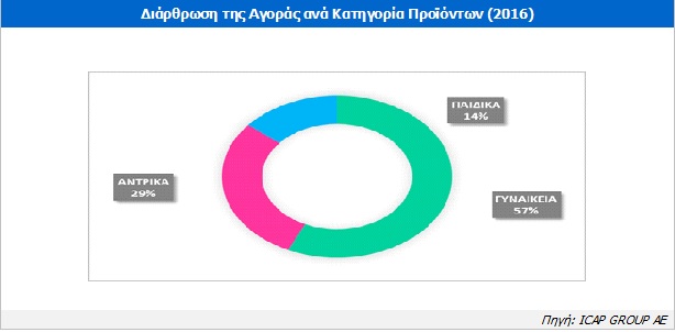 Σύμφωνα με εκτιμήσεις, οι πωλήσεις των γυναικείων ειδών απέσπασαν μερίδιο 57% επί των συνολικών πωλήσεων των εξεταζόμενων προϊόντων, το 2016. Η κατηγορία των ανδρικών ειδών κάλυψε το 29% της αγοράς, ενώ τα παιδικά είδη αντίστοιχα απέσπασαν μερίδιο της τάξης του 14% το ίδιο έτος.