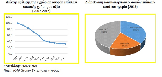 Σύμφωνα με την Ελένη Δεμερτζή, Senior Manager της ICAP Group, η οποία είχε την υψηλή εποπτεία της ομάδας μελετητών της συγκεκριμένης μελέτης, η εγχώρια παραγωγή οικιακών επίπλων (σε αξία) παρουσιάζει συνεχή μείωση από το 2008 και μετά. Ωστόσο, ο ρυθμός μείωσης βαίνει μειούμενος τα τελευταία έτη (2016/15:-4,5%, 2015/14:-8,3%, 2014/13: -10,4%).