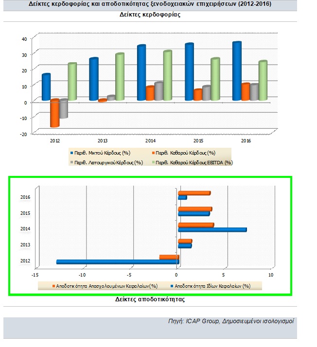 Από δείγμα 137 ξενοδοχειακών επιχειρήσεων, ανοδικά κινήθηκε το μέσο περιθώριο μικτού κέρδους την περίοδο 2012-2016, ενώ αντίθετα πτωτικά κινήθηκε το μέσο περιθώριο κέρδους EBITDA τη διετία 2015-2016.