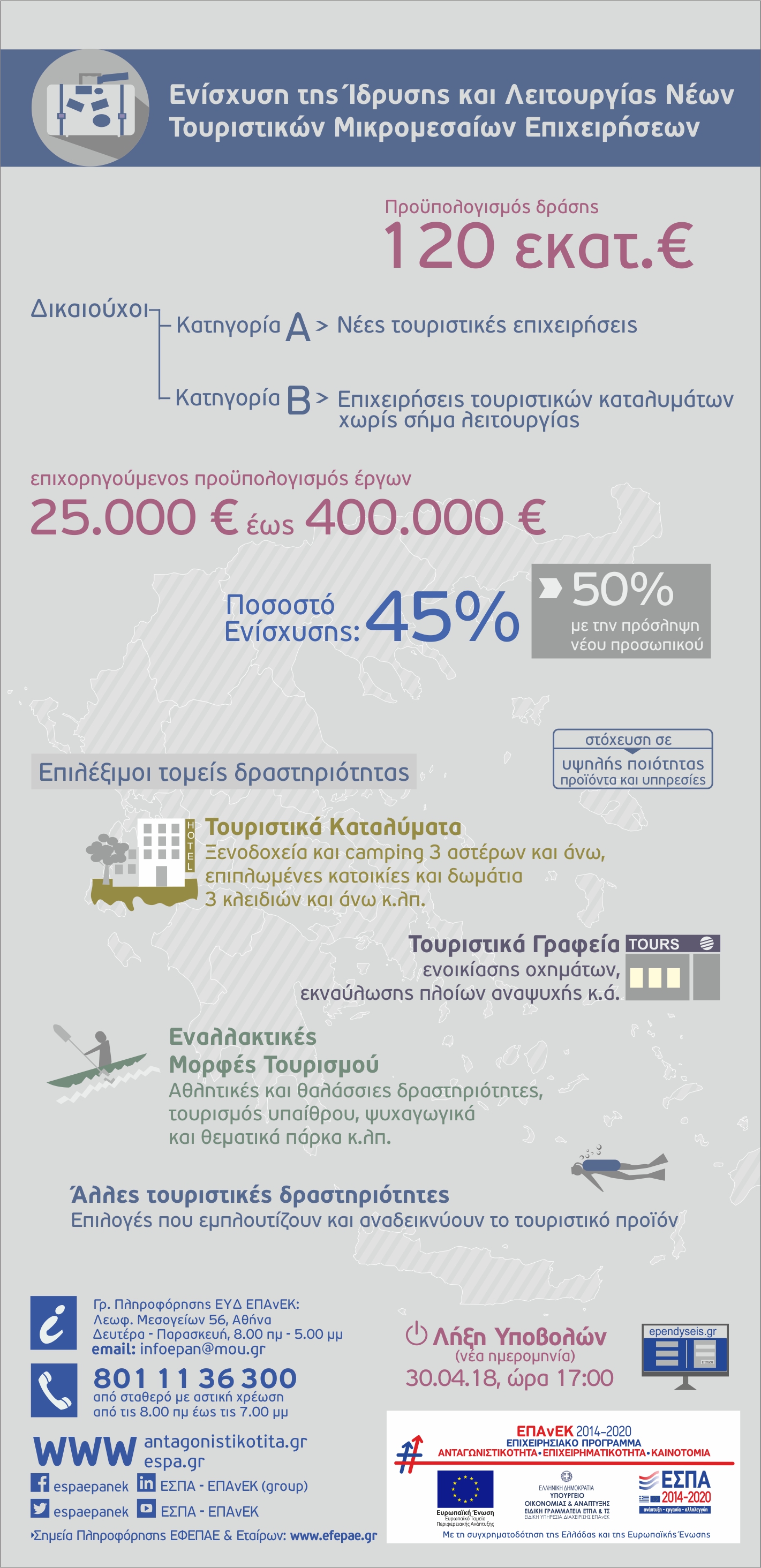 Η Δράση του ΕΠΑνΕΚ για την ενίσχυση της ίδρυσης νέων πολύ μικρών, μικρών και μεσαίων τουριστικών επιχειρήσεων, με συνολικό προϋπολογισμό 120 εκατ. €, σχεδιάστηκε με βασικό στόχο την επένδυση σε υψηλής ποιότητας τουριστικά προϊόντα και υπηρεσίες. Επιδοτούνται επιχειρηματικά σχέδια προϋπολογισμού από 25.000 € έως 400.000 €. Η δράση συγχρηματοδοτείται από το Ευρωπαϊκό Ταμείο Περιφερειακής Ανάπτυξης (ΕΤΠΑ) της Ευρωπαϊκής Ένωσης και από εθνικούς πόρους.