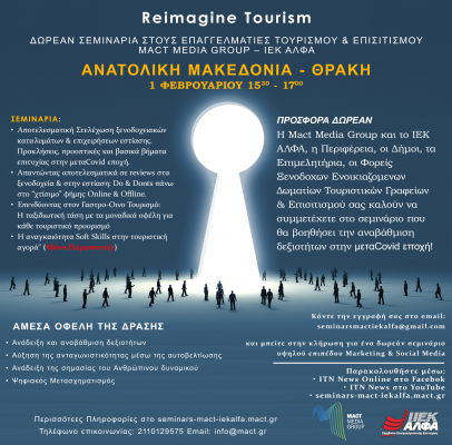 Η Mact Media Group και ο Τομέας Τουρισμού του ΙΕΚ ΑΛΦΑ σε μια προσπάθεια ενίσχυσης των επαγγελματιών στους κλάδους του Τουρισμού και της Μαζικής Εστίασης ξεκινούν με το νέο έτος ένα νέο κύκλο ΔΩΡΕΑΝ επιμορφωτικών σεμιναρίων που απευθύνονται σε: