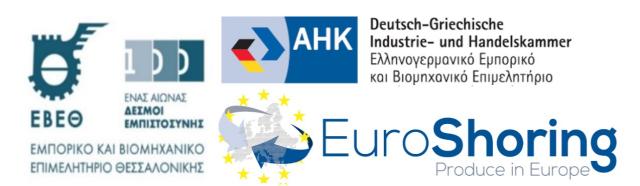Διαδικτυακή ημερίδα για την παρουσίαση της ηλεκτρονικής πλατφόρμας EuroShoring πραγματοποιεί το Εμπορικό και Βιομηχανικό Επιμελητήριο Θεσσαλονίκης και το Ελληνογερμανικό Εμπορικό και Βιομηχανικό Επιμελητήριο την Πέμπτη 13 Μαϊου 2021 και ώρες 14:00- 15:00.