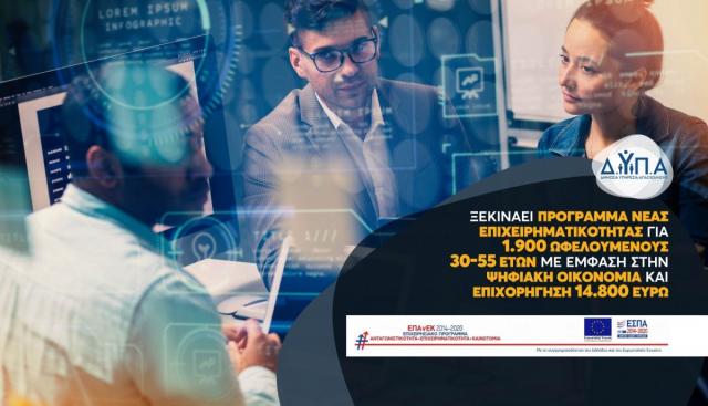 Τη Δευτέρα, 23 Οκτωβρίου 2023 και ώρα 13:00, ξεκινάει η υποβολή ηλεκτρονικών αιτήσεων χρηματοδότησης για το νέο πρόγραμμα νέας επιχειρηματικότητας για 1.900 ωφελούμενους ηλικίας 30 έως 55 ετών με έμφαση στην ψηφιακή οικονομία.
