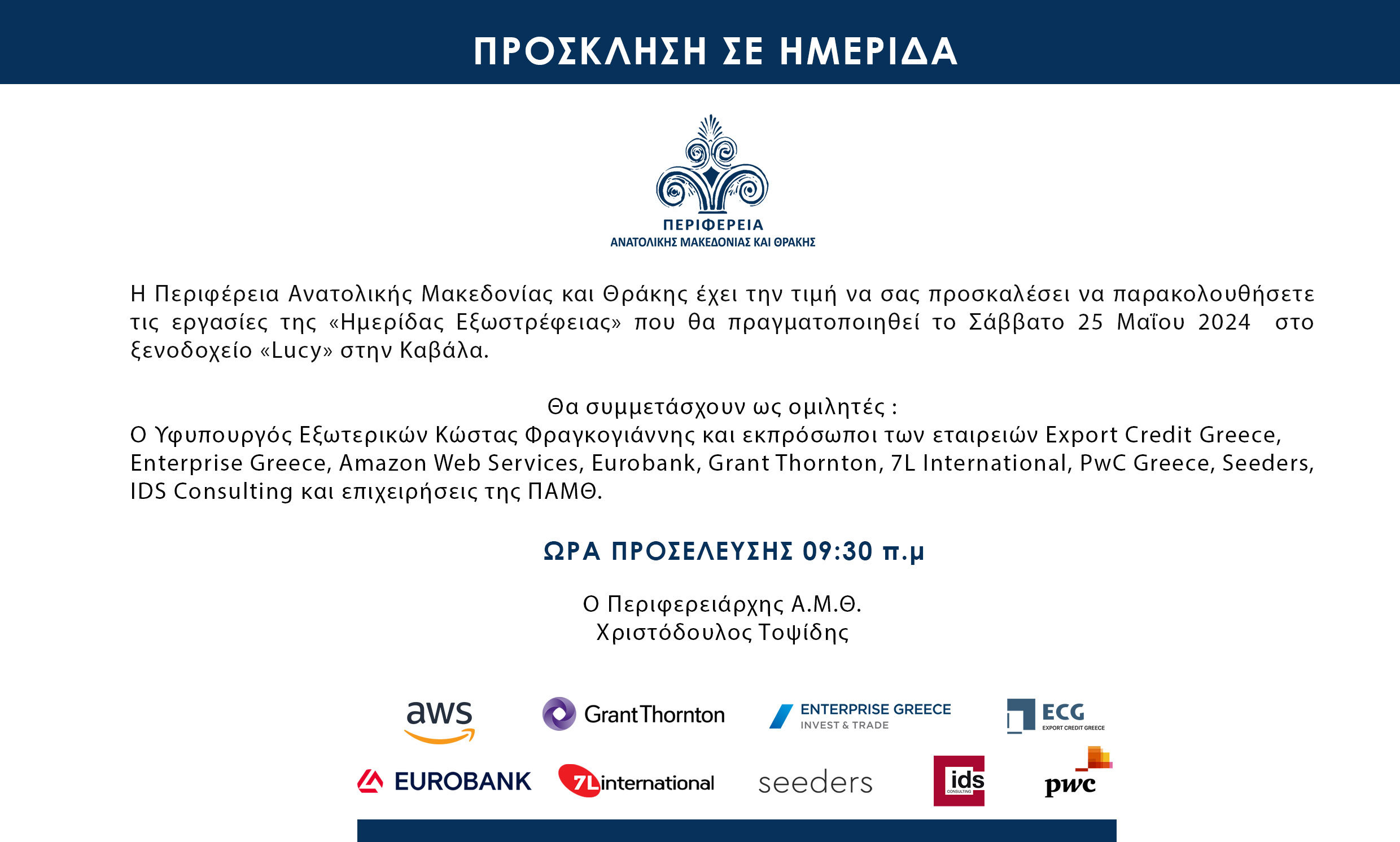 Στην ημερίδα θα συμμετάσχουν ως ομιλητές ο Υφυπουργός Εξωτερικών κ. Κώστας Φραγκογιάννης και εκπρόσωποι των εταιρειών Export Credit Greece, Enterprise Greece, Amazon Web Services, Eurobank, Grand Thornton, 7L International, PwC Greece, Seeders, IDS Consulting και επιχειρήσεις της Περιφέρειας ΑΜΘ.