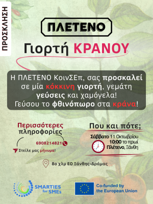 Το Σάββατο 11 Οκτωβρίου 2025, η Κοινωνική Συνεταιριστική Επιχείρηση Πλέτενο ΚοινΣΕπ προσκαλεί το κοινό στη «Γιορτή Κράνου», μια ξεχωριστή φθινοπωρινή εκδήλωση που θα πραγματοποιηθεί στο Πλέτενο, στο 8ο χλμ Ξάνθης–Δράμας.