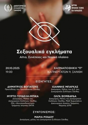 Ο Δικηγορικός Σύλλογος Ξάνθης και το Ίδρυμα Θρακικής Τέχνης και Παράδοσης, διοργανώνουν, την Δευτέρα 20 Οκτωβρίου 2025, στις 19:00, στην Καπναποθήκη «Π», διάλεξη με θέμα: «Σεξουαλικά εγκλήματα: Αίτια, Συνέπειες και Νομικό πλαίσιο»