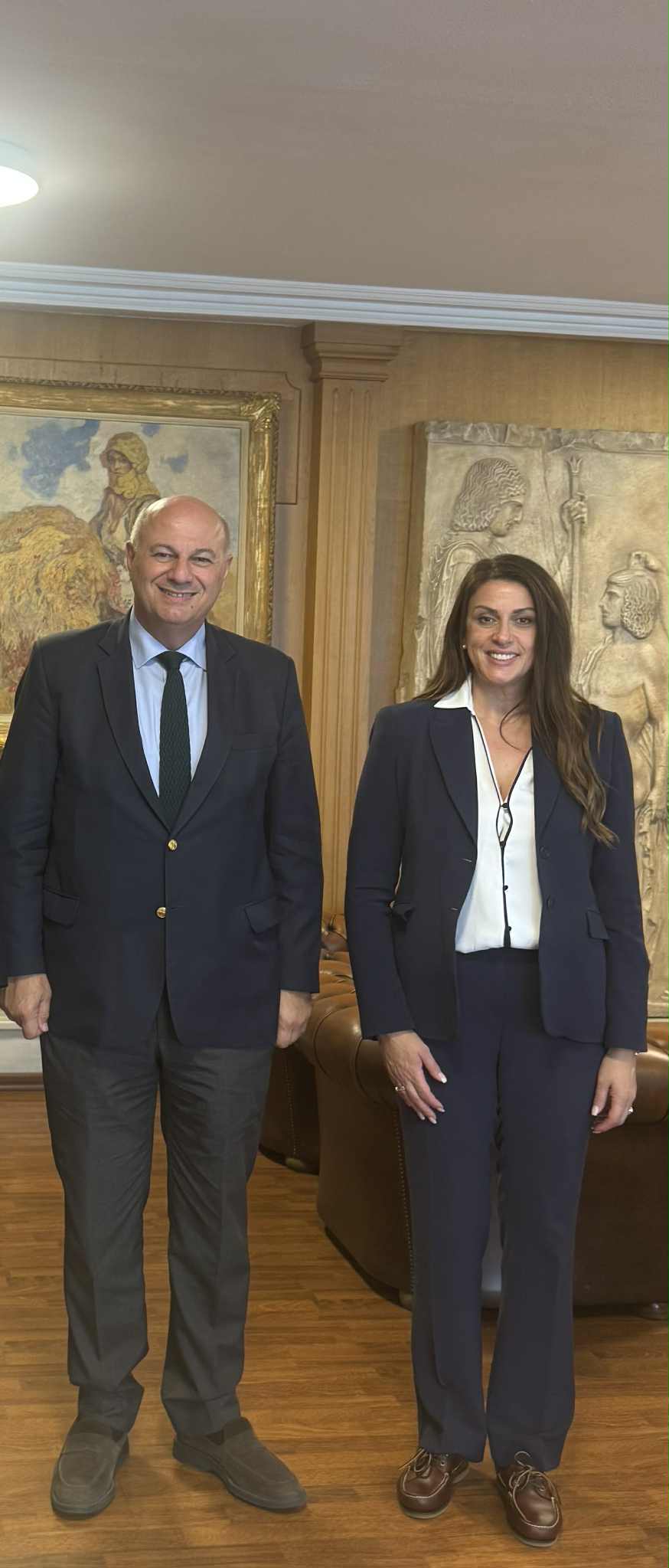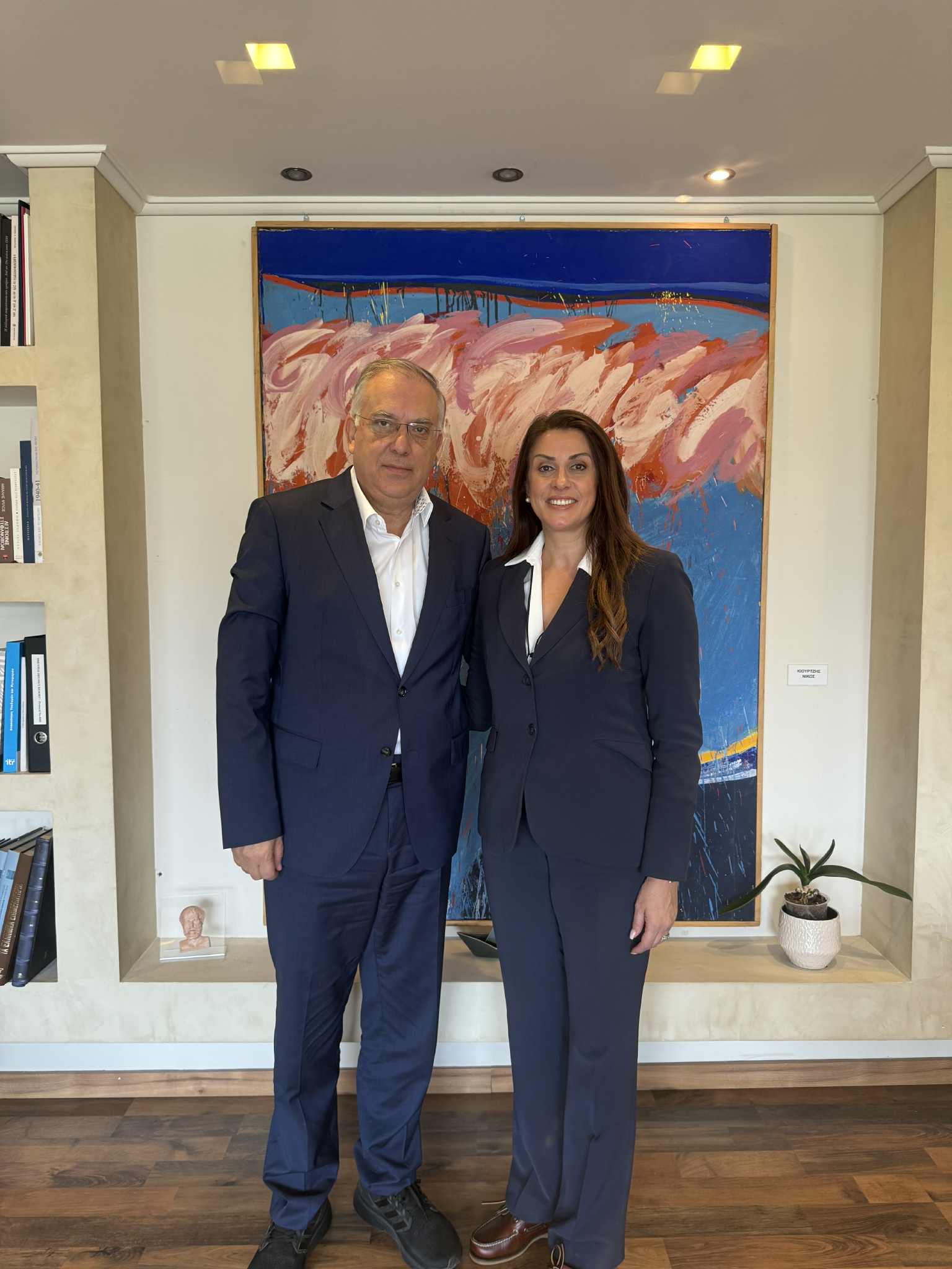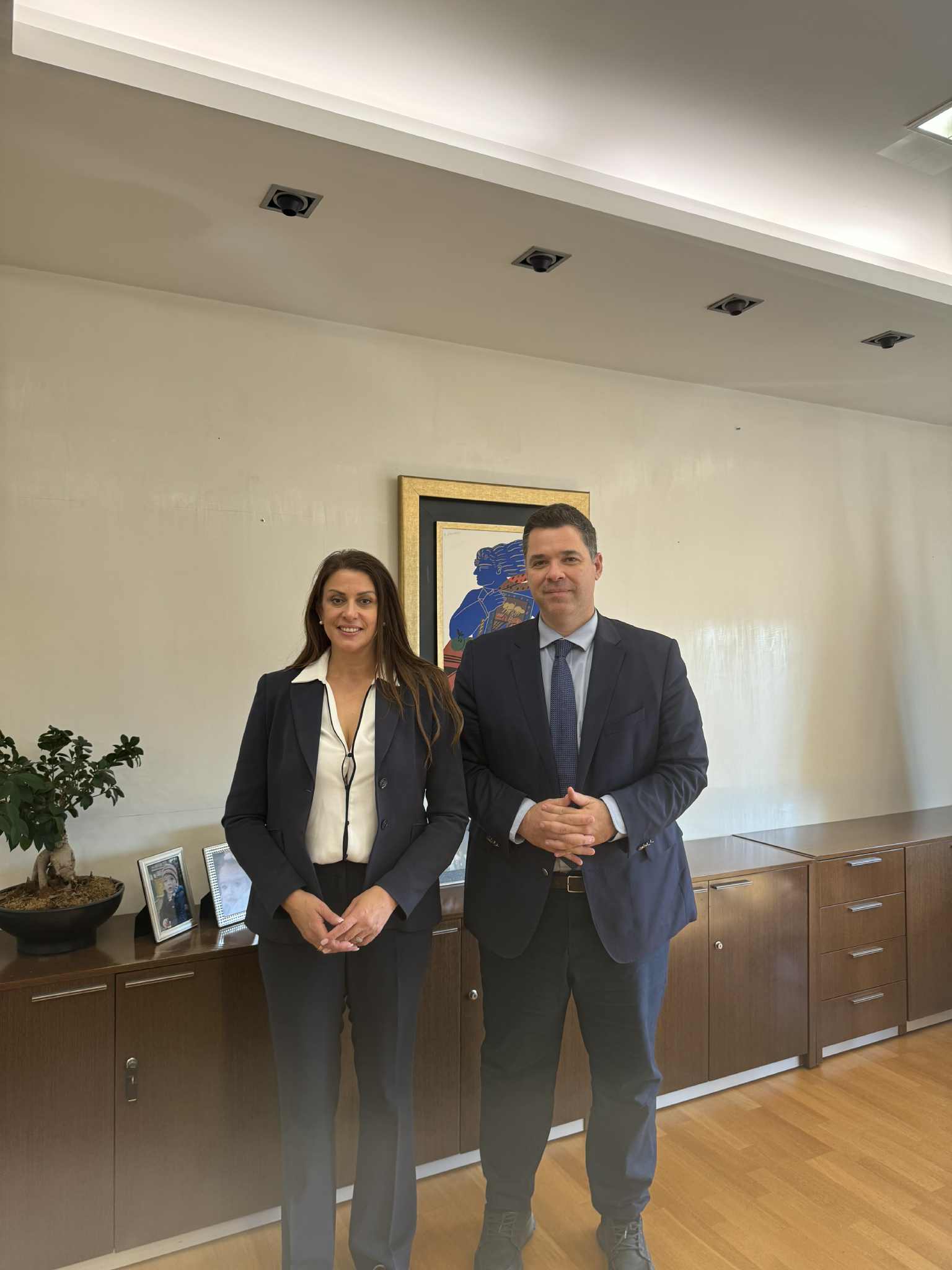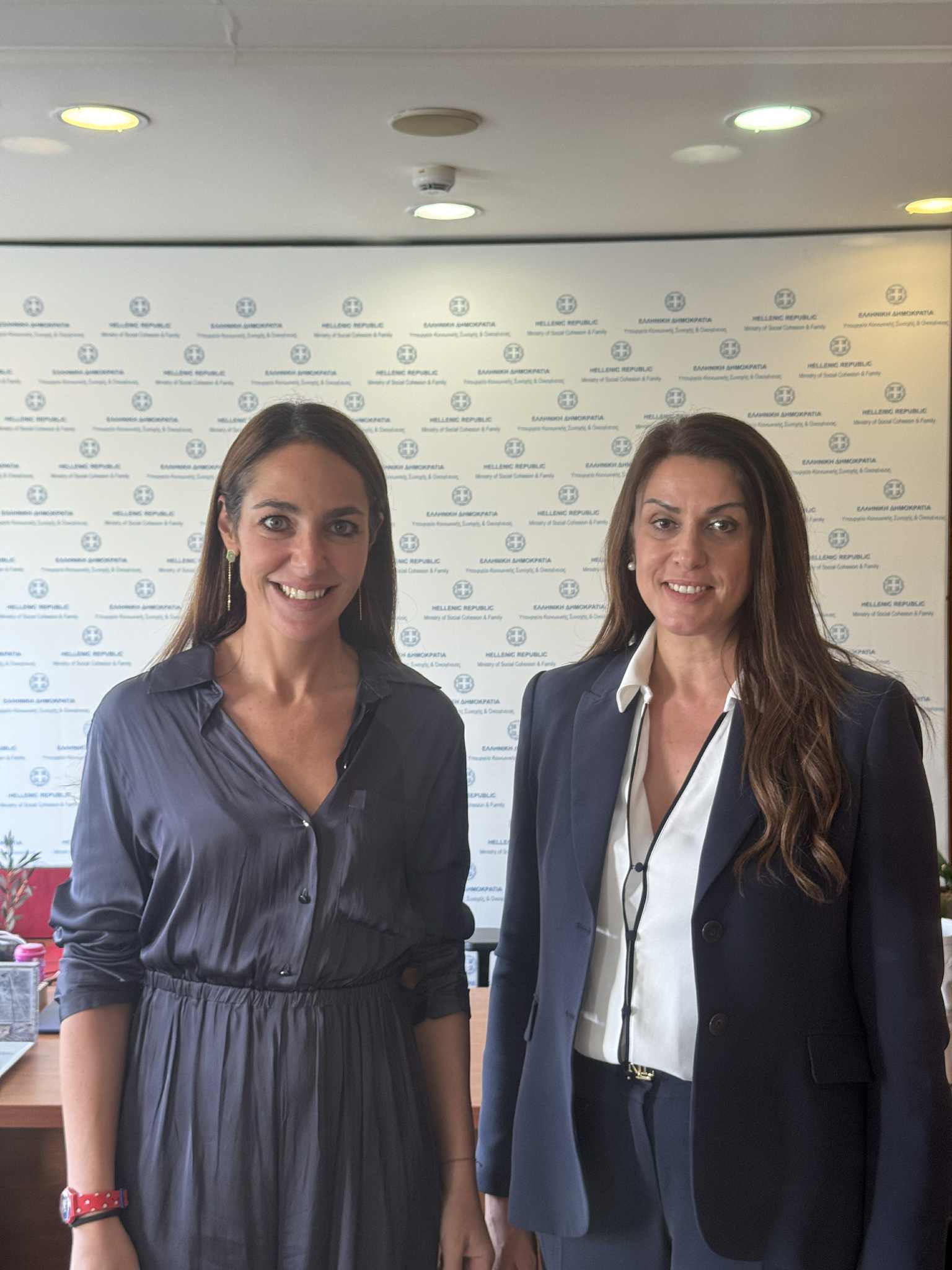 - Με την Υπουργό Κοινωνικής Συνοχής & Οικογένειας, κα Δόμνα Μιχαηλίδου, με την οποία συζητήθηκαν πολιτικές που συνδέουν την κοινωνική συνοχή με την επιχειρηματικότητα και την τοπική ανάπτυξη, με στόχο τη δημιουργία ενός ολοκληρωμένου πλαισίου ενίσχυσης των μικρομεσαίων και οικογενειακών επιχειρήσεων.