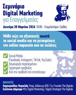 Το Επιμελητήριο Ξάνθης διοργανώνει εκπαιδευτικό σεμινάριο με θέμα το Digital Marketing για επαγγελματίες, με στόχο την ουσιαστική ενίσχυση της ψηφιακής παρουσίας των τοπικών επιχειρήσεων.