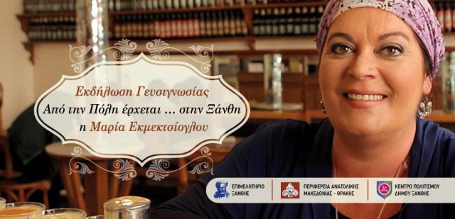 Το Επιμελητήριο Ξάνθης, η Περιφέρεια ΑΜ-Θ – Π.Ε. Ξάνθης και το Κέντρο Πολιτισμού Δήμου Ξάνθης σας προσκαλούν σε ένα ταξίδι στα μονοπάτια της γαστρονομικής απόλαυσης, στις ευωδιές και στις γεύσεις της Ξάνθης με οδηγό την κα. Μαρία Εκμεκτσίογλου, τη σύγχρονη… Λωξάντρα της Πόλης.
